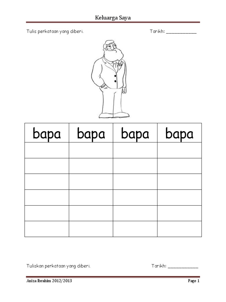 Web Lembaran kerja Latihan Suku Kata Anggota Badan ini sesuai untuk anda mengajar dan memperkukuhkan kemahiran mengenal suku kata kanak-kanak di peringkat awal. Web Sumber Keluarga Saya - Lengkapkan Suku Kata ini direka oleh guru untuk anda gunakan bagi melatih kanak-kanak menulis perkataan dengan mudah. Lembaran kerja 1 2 tampalkan ahli keluarga pada gambar di bawah.
